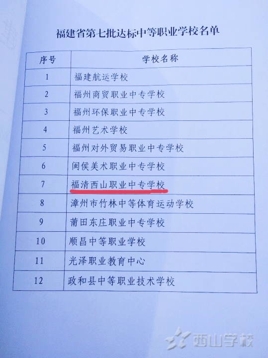 不忘初心,砥砺前行。近日,福建省教育厅下发关于公布第七批达标中等职业学校的通知,福清西山职业技术学校成功入选达标校名单。这标志着,西山职业技术学校比以往任何时期,都更接近规范化学校发展的目标,都更牢记让每一位中职生都有人生出彩机会的初心和使命。
